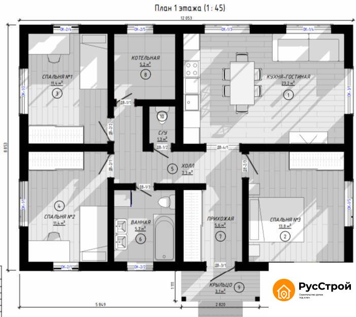 Индивидуальный каркасный дом KD-113 — это уютный одноэтажный дом площадью 106 кв.м из кирпича. Компактные габариты 6 x 9 м делают его идеальным решением для небольших участков, при этом обеспечивая достаточно пространства для комфортного проживания.