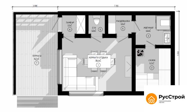 Ленточный фундамент и стены из СИП-панелей обеспечивают быстрое строительство и отличную энергоэффективность. Несмотря на компактные размеры, дом спроектирован с максимальной функциональностью. Терраса увеличивает полезное пространство для отдыха.
