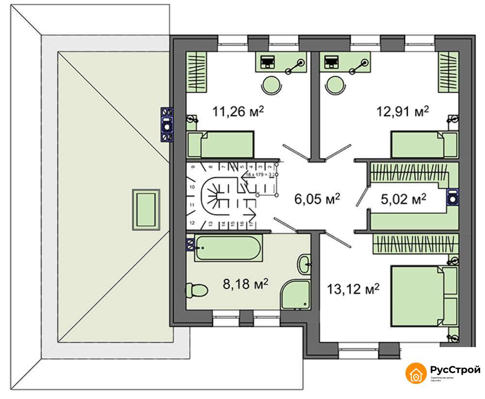 Симпатичный дом в два этажа площадью 146 м2 — это современный дом из СИП-панелей. Габариты 12,8 x 9,5 м создают удобную прямоугольную планировку, обеспечивающую максимальную функциональность и комфорт для большой семьи.